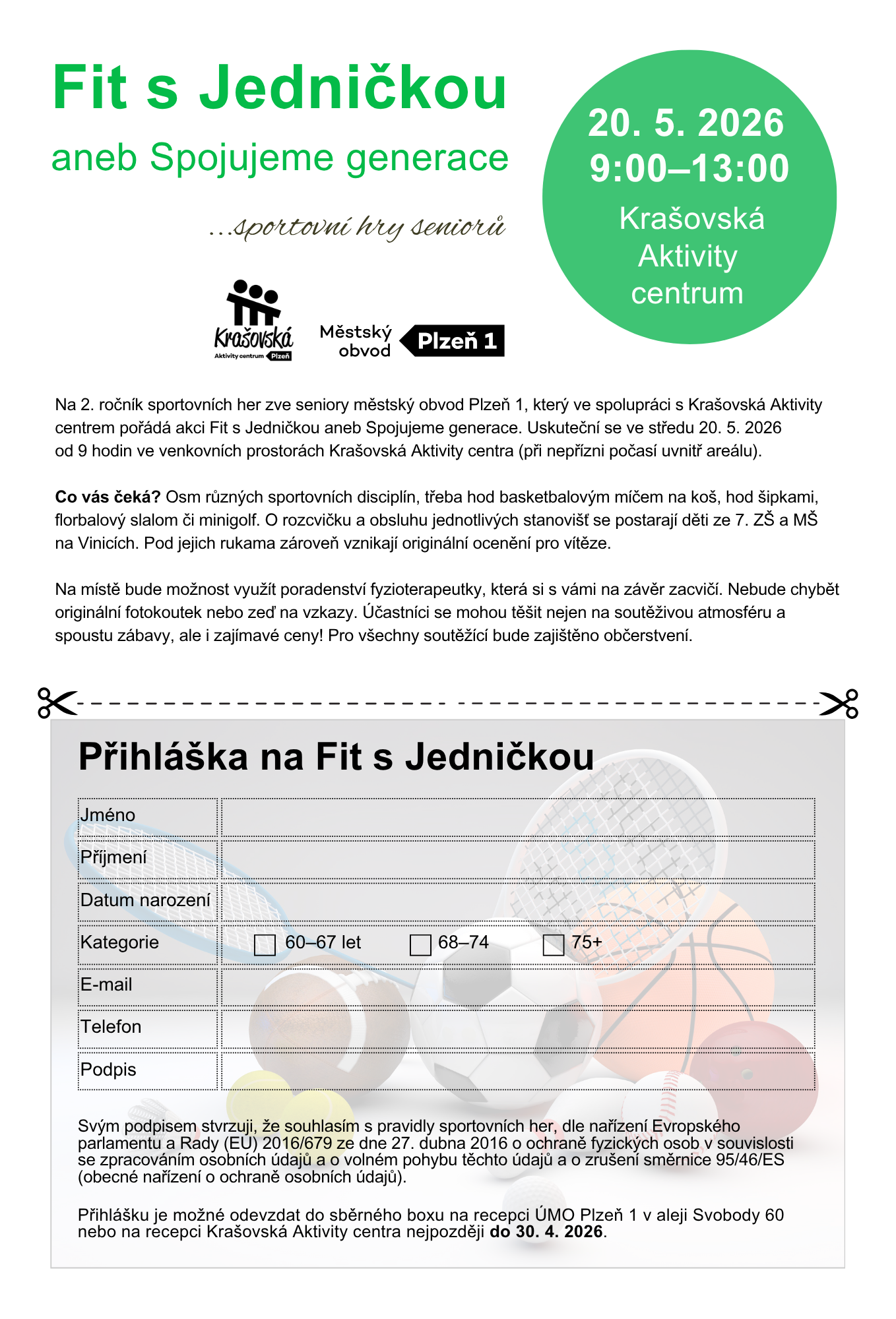 Pokud se chtějí zájemci zapojit, stačí vyplnit přihlášku a odevzdat ji nejpozději do 30. dubna na recepci ÚMO Plzeň 1 v aleji Svobody 60 nebo na recepci Krašovská Aktivity centra na Košutce.